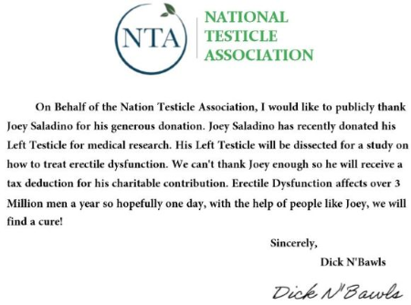 Saladino claimed to have not only donated his own testicle, he also said he got a letter of acknowledgement from the National Testicle Association, NTA.